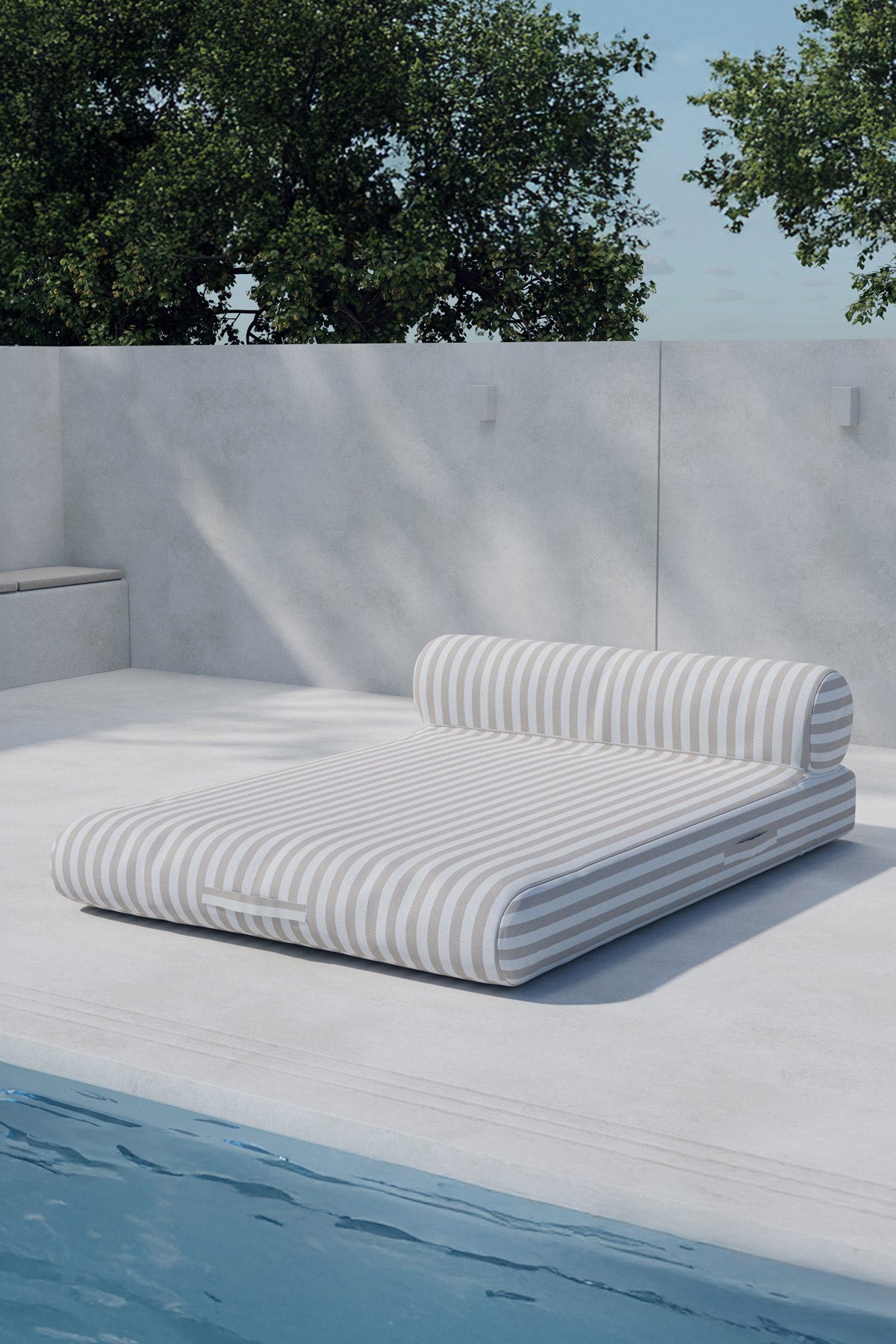 Redang solsĂ€ng â en stilfull och bekvĂ€m solsĂ€ng i beige och vita rĂ€nder. Den generösa designen tillsammans med den mjuka kudden ger hög komfort och en avslappnad kĂ€nsla, perfekt för lata dagar vid poolen, pĂ„ altanen eller i trĂ€dgĂ„rden. Plats för tvĂ„ personer. Med sitt randiga mönster blir Redang solsĂ€ng en bĂ„de praktisk och dekorativ detalj i din utomhusmiljö.
